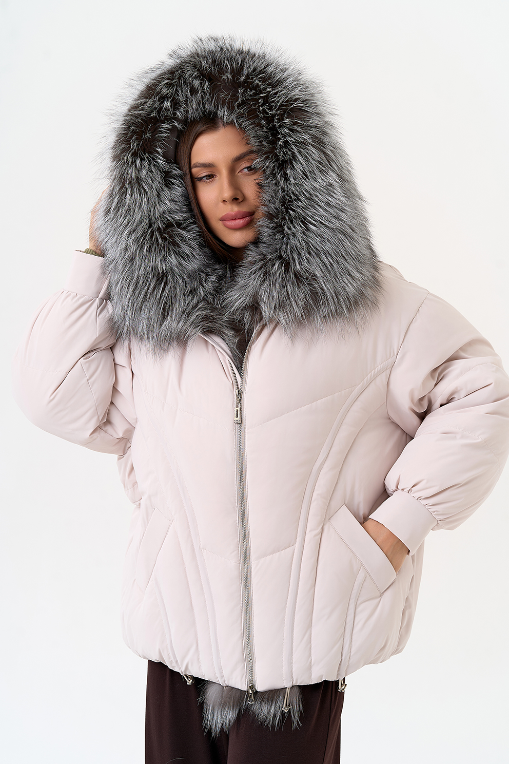 Крой воротника - капюшон, отделка чернобурка